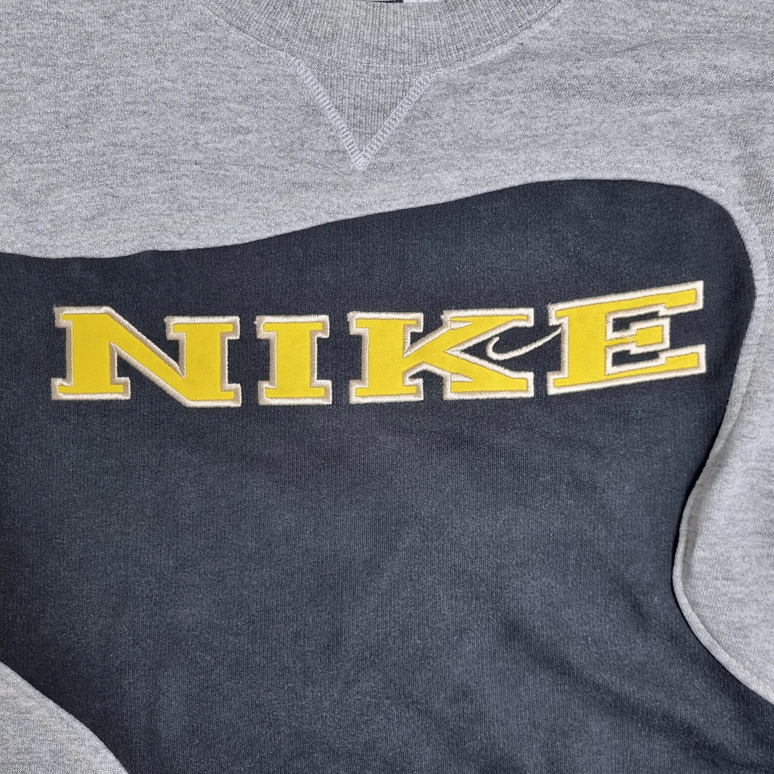 Authentisches Nike Team Vintage Sweatshirt aus der späten 1990er-Ära. Das Crewneck kombiniert klassisches Heather Grey mit tiefem Schwarz in einem ikonischen asymmetrischen Colorblock-Design, abgerundet durch einen gelben 3D-Stick-Schriftzug mit Mini-Swoosh.