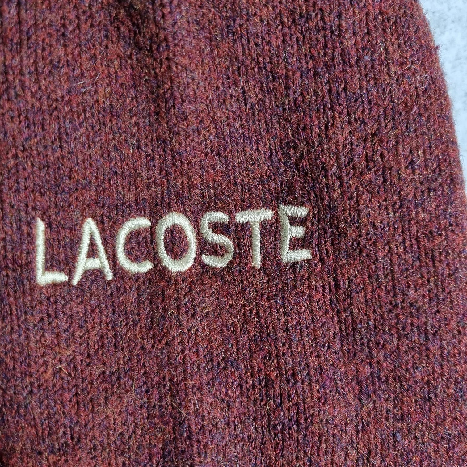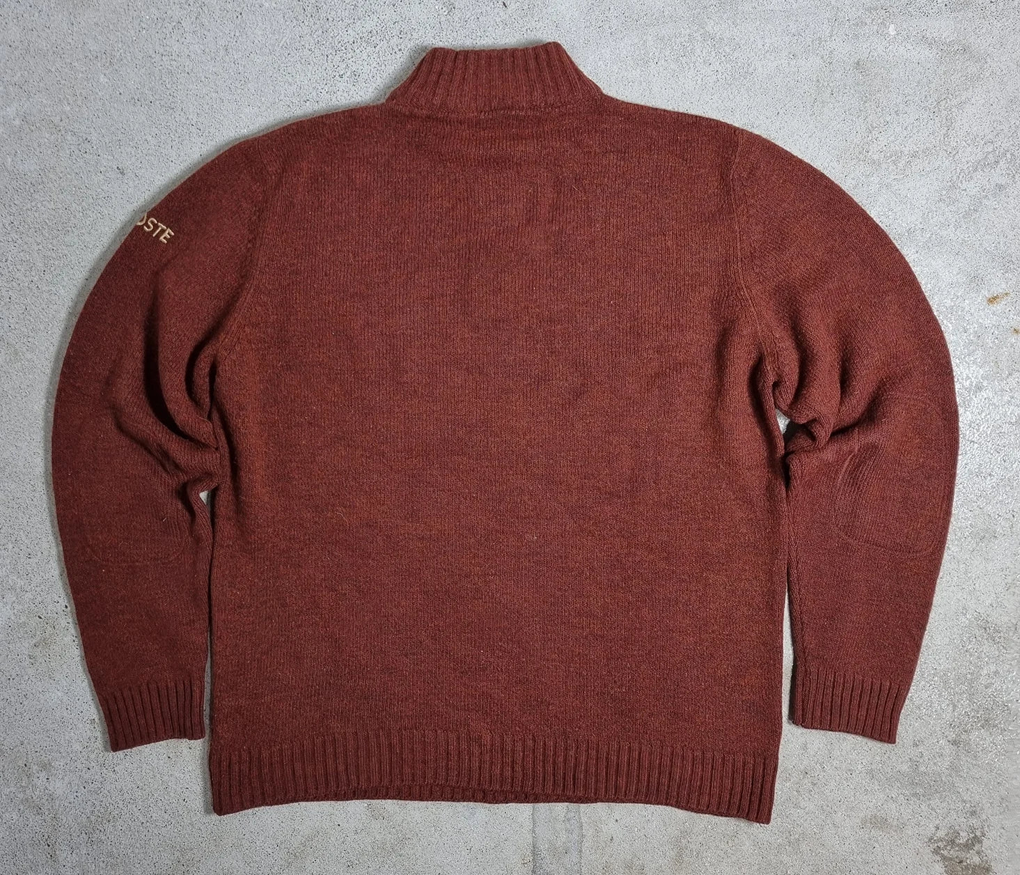 Original Lacoste Vintage Wool Half-Zip Sweater in einem warmen Braun-Rot-Melange-Ton mit Streifendetail in Beige und Rostrot über der Brust.