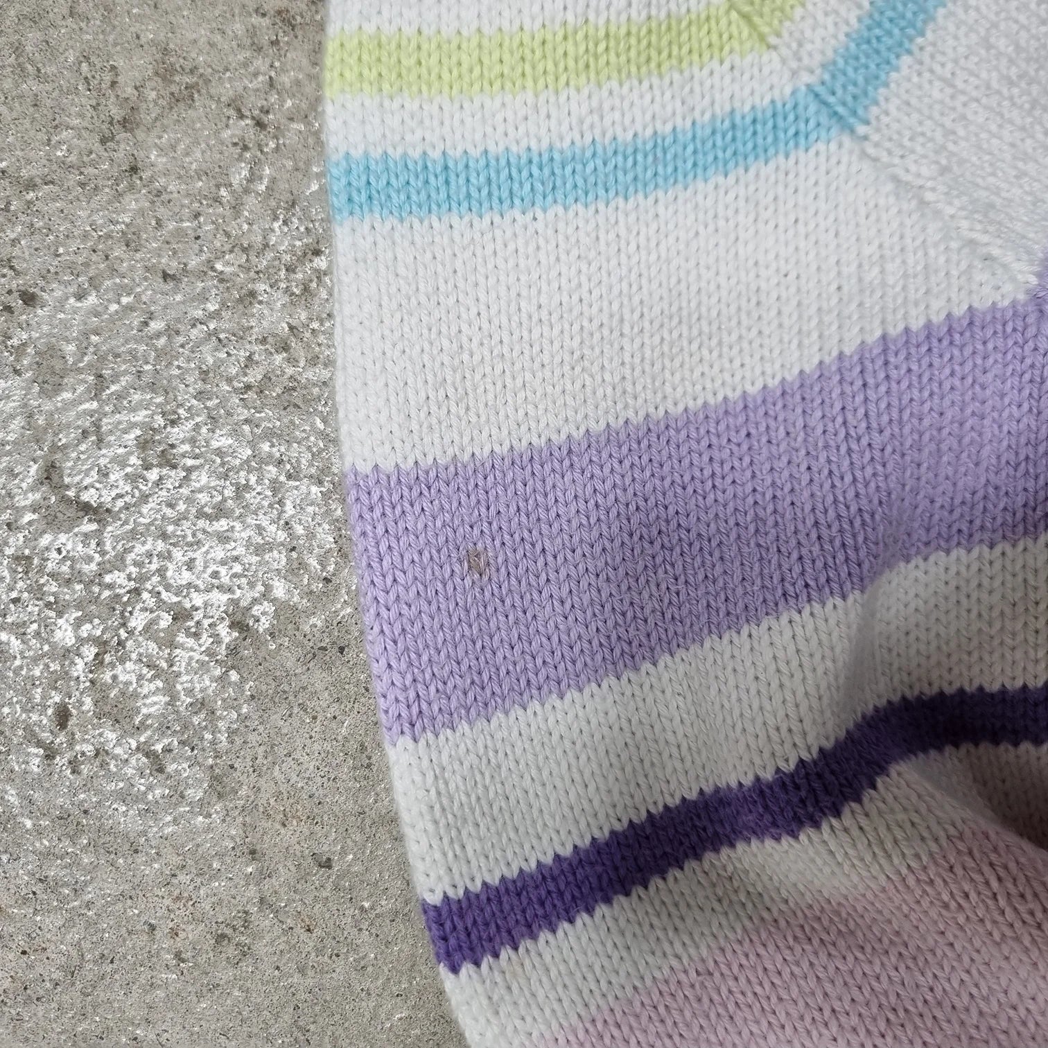Original Lacoste Vintage Women’s Knit Sweater mit auffälligem mehrfarbigem Streifenmuster und klassischem Rippkragen mit Knopfleiste.
